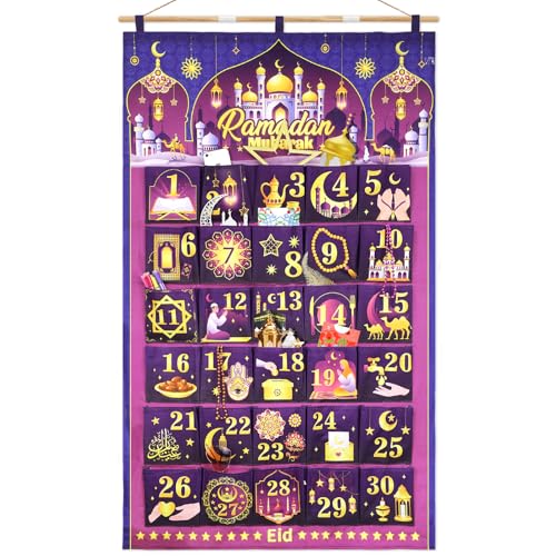 DPKOW 30 tyg-ramadankalender med fickor, återanvändbar adventskalender i ramadan tom att fylla hängande för vägg, hem, ramadan, dekoration, nedräkningskalender för gåvor, ramadan, lila guld