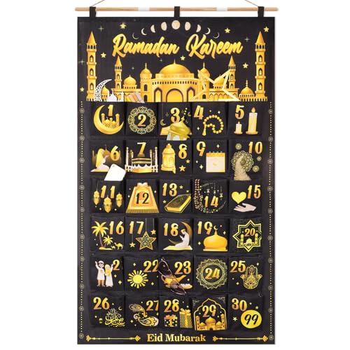 DPKOW 30 ramadankalender med fickor, återanvändbar tyg-ramadan-adventskalender tom att fylla hängande för vägg, hem, ramadan, dekoration, nedräkningskalender för gåvor, ramadan, svart guld