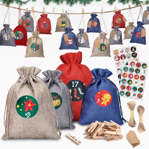 EIKJI Adventskalender för fyllning stor (18 x 13 cm), 24 jutesäckar adventskalender för fyllning av tyg, adventskalender själv, adventskalender påse, adventskalender 2024 barn