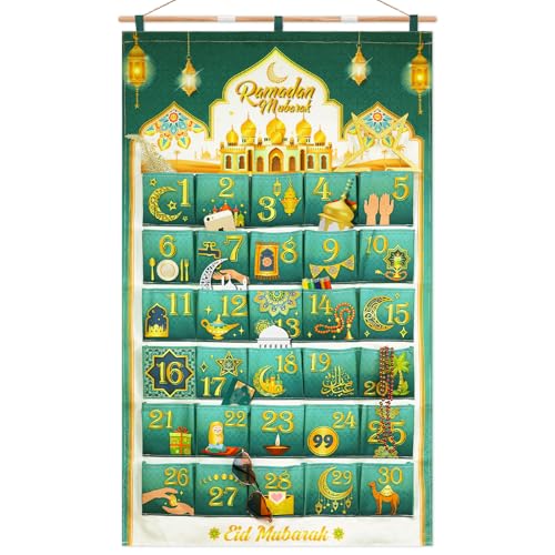 DPKOW 30 ramadankalender med fickor, återanvändbart tyg ramadan adventskalender tom att fylla hängande för vägg, hem, ramadan, dekoration, nedräkningskalender för gåvor, grönt guld