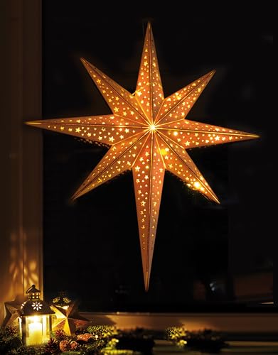LED-stjärna av trä, upplyst med 10 lysdioder, trådlös inkl. fjärrkontroll, 40 cm eller 52 cm, olika mönster, fönsterstjärna, trästjärna, juldekoration, adventsstjärna (52 cm, stjärnlook)