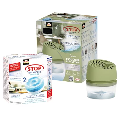 Pattex AERO 360° kompakt avfuktare Green Colour Collection och 3 x 450 g påfyllningsflikar, minskar fukt och dålig lukt, enhet inkl. 3 påfyllningsflikar