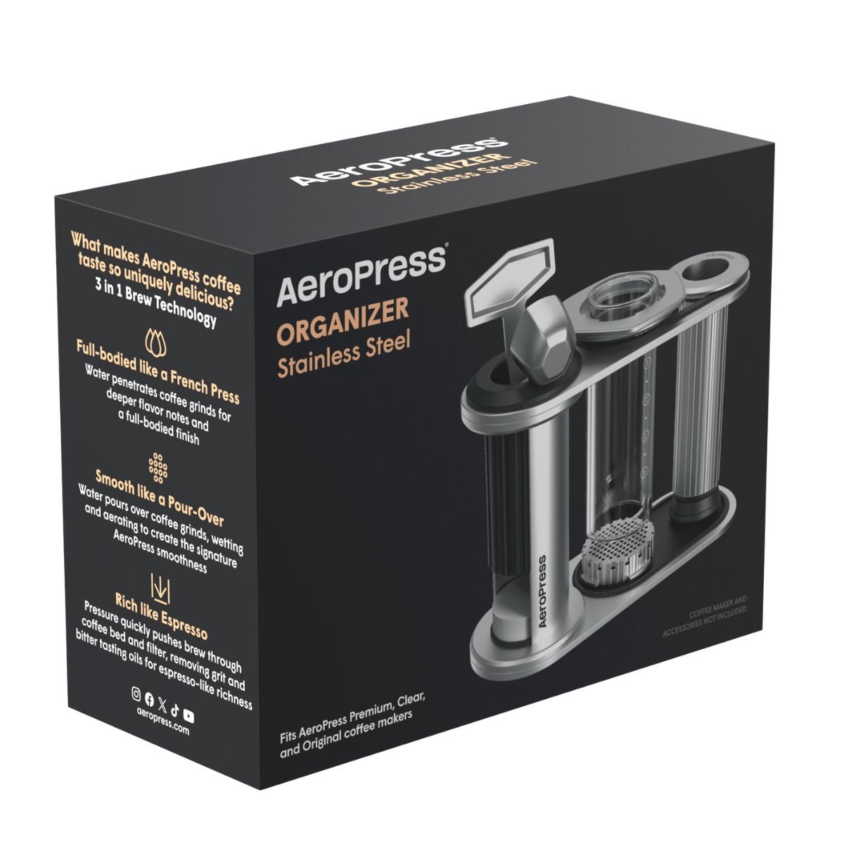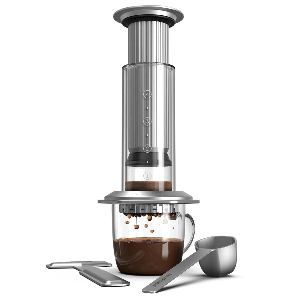 AeroPress Premium kaffepress, manuell kaffebryggare i glas, rostfritt stål och anodiserad aluminium, allt-i-ett French Press för pour-over och espresso, snabb bryggning på 2 minuter, Silver