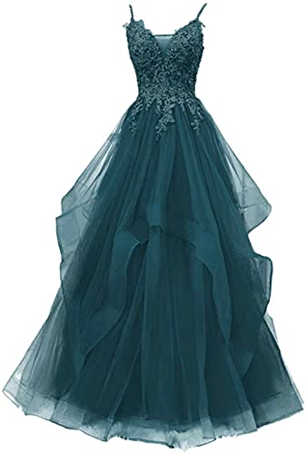 Xinaier Tyllklänning med spagettiremmar för damer, lång, formell aftonklänning, balklänning, brudklänning, anpassbar, Påfågel grön, 36