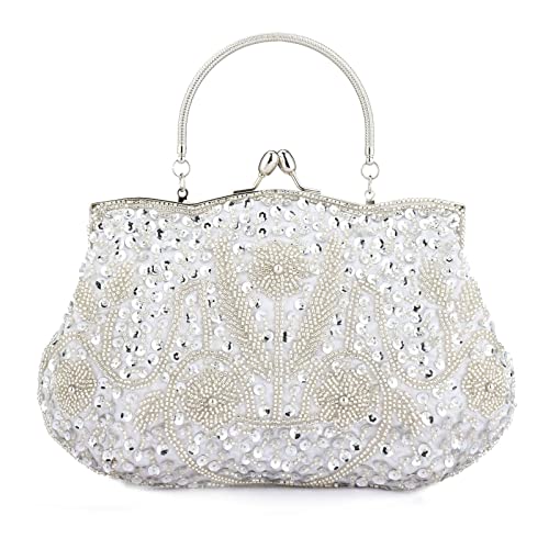 YYW samling antik blommig pärla paljett mjuk kuvertväska aftonväska designerhandväska stor handväska, SILVER, en storlek