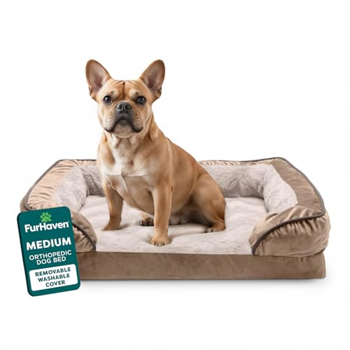 FurHaven Husdjurssäng för hundar och katter – plysch och sammetsvågor perfekt komfort soffstil ägglåda ortopedisk hundsäng, avtagbart maskintvättbart skydd – brunsten, medium