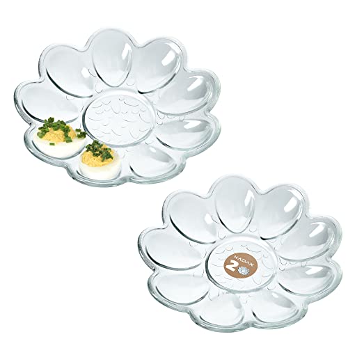 KADAX Äggtallrik av glas, ⌀ 21,5 cm, praktisk tallrik för ägg, ägghållare, robust ägghylla, ägglåda, äggbricka, äggdispenser (2 x blomformar, transparent, 18 ägg (2 x 9))