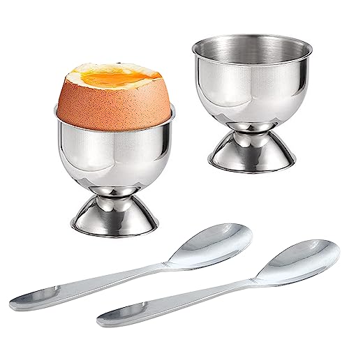 Äggkopps-set, 2-delad äggkopp rostfritt stål med 2 delar äggskedar äggkopp metall påsk äggkopp stativ för mjuka kokta ägg