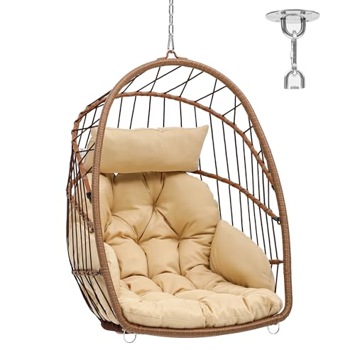 YITAHOME Rottingäggstol, gungäggstol med kuddar, robust stålram, 105 x 74 x 72 cm hängande äggstol med en kedja och S-krok för uteplats, trädgård, vardagsrum, brun äggstol och beige kudde