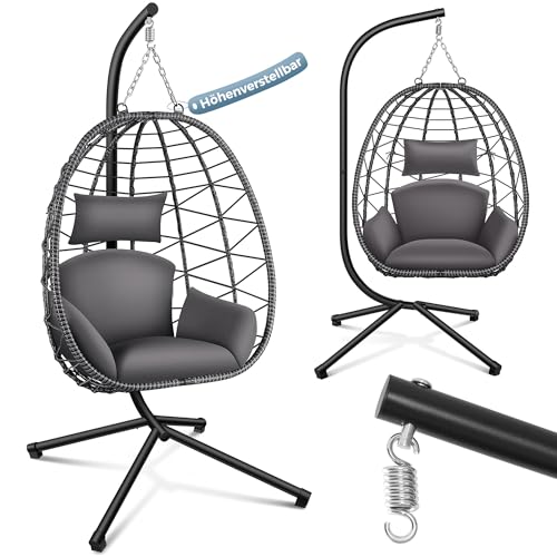 Makika Äggstol med stativ, hopfällbar trädgårdsgungstol inomhus och utomhus – rottingstolshängmatta med kuddar, robust bas, justerbar höjd – för vardagsrum, balkong, uteplats i grått