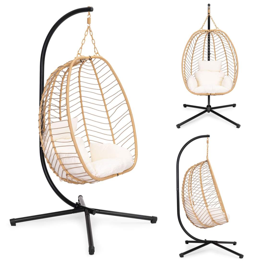 Hopfällbar äggstol i rotting, hängande stol, inomhus, utomhus, hängstol, hängmatta, stol med hängsats i rostfritt stål, UV-beständig, kudde, för sovrum, balkong