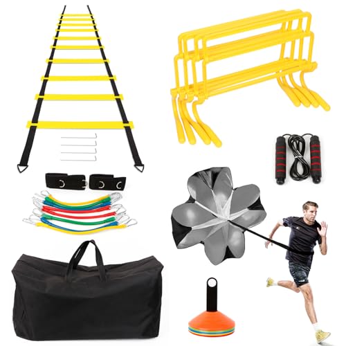 Agility stege hastighetsträningsutrustning, 20 fot hastighetsstege, 4 hinder, 10 fartskottar, fallskärm, fotboll basket fotboll träningsutrustning för barn ungdomar vuxna – förbättra hastigheten