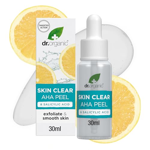 Dr Organic Skin Clear AHA Peel med fruktsyror, peeling serum, akne, ärr, anti-fläckar, naturlig blekning, vegansk, djurförsöksfri, paraben- och SLS-fri, biologisk, 30 ml
