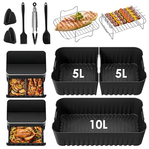 Air Fryer silikonfoder tillbehör för CoSORI Dual Airfryer TwinFry, 1 x 10 L + 2 x 5 L stort flexibelt foder, luftfritöskorgar, grillställ, tång, oljeborste ingår (för 10 L 14 st)