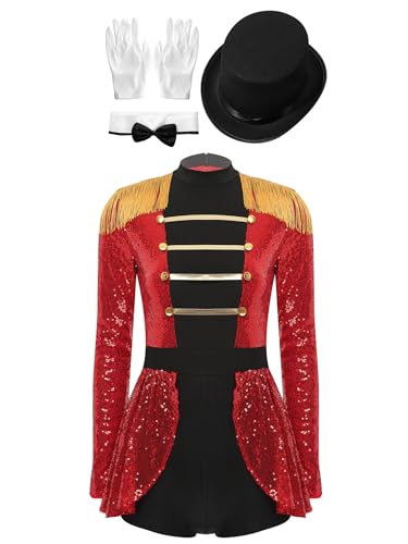 Kaerm cirkus kostym dam akrobatik kostym paljetter overall långärmad body fransar tofs jumpsuit med handskar rosett hatt karneval kostym, röd, M