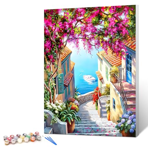 Gelrovaled målning efter siffror vuxna, gör-det-själv handmålad oljemålning kit för nybörjare och vuxna med 3 penslar och akrylfärg, utan ram 40 x 50 cm (Lake Sea Town)