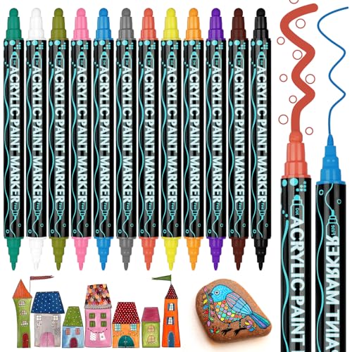 AUAUY 12 st akrylfärger pennor, akrylpennor för stenar vattentäta med dubbel spets, dubbelspetspenna för ritning och målning, akrylfärg pennor måla för trä keramik glas canvas keramik hantverk
