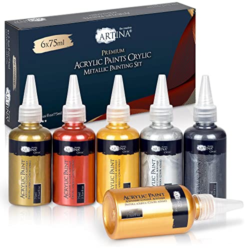 Artina 6 x 75ml (2.5 Oz) Akrylfärgset Metallic Crylic - Akrylfärg Guld, Silver, Brons, Koppar - Glänsande Metallic Akrylfärger för Penslar och Målarknivar på Canvas, Lera, Papper, Betong