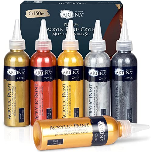 Artina 6 x 150ml (5.0 Oz) Akrylfärgset Metallic Crylic - Akrylfärg Guld, Silver, Brons, Koppar - Glänsande Metallic Akrylfärger för Penslar och Målarknivar på Canvas, Lera, Papper, Betong