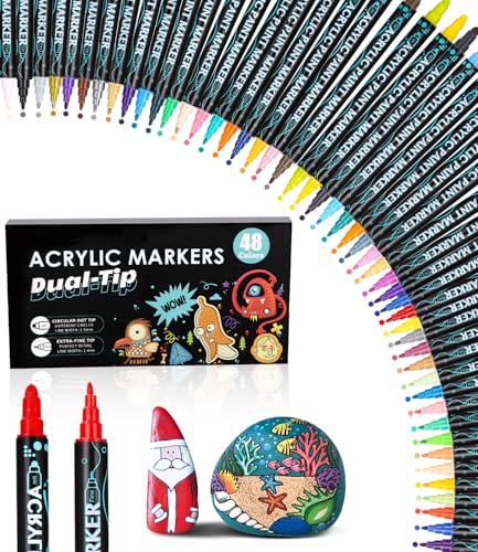 Akrylpennor för stenar vattentäta, akrylfärger pennor, 48 pennor dubbla spetsar akrylfärger pennor stenar måla set, akrylfärger för stenar trä, glas, duk, sten, tyg, gör-det-själv fotoalbum, keramik