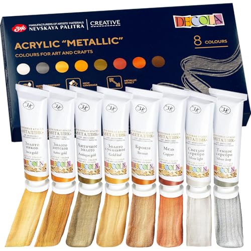 Decola - Metallisk effekt akrylfärger set | 8 x 18 ml metalliska akrylfärgrör | måla och dekorera på alla ytor | av Nevskaya Palitra
