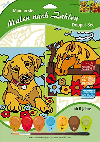 Mamma spel & present 102001 Min första målning efter nummer, djurmotiv, hund & häst, dubbelpack, komplett set med 2 tryckta målarbilder, 7 akrylfärger och penslar, målningsset för barn från 5 år