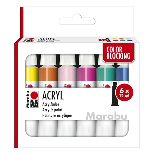 Marabu akrylfärger set färgblock, 6 x 12 ml sidenmatt färger, lätt att måla, snabbtorkande, ljusäkta, väderbeständig, för många målningstekniker och underlag, 12100000213, 6 basfärger