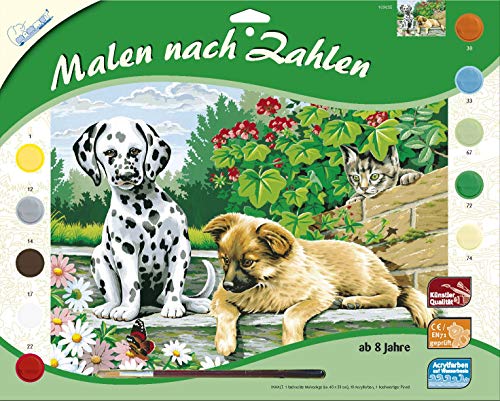 MAMMUT 109035 – måla med siffror djurmotiv, djurbarn i trädgården, komplett set med tryckt målarbil i A3-format, 10 akrylfärger och borstar, stort målningsset för barn från 8 år
