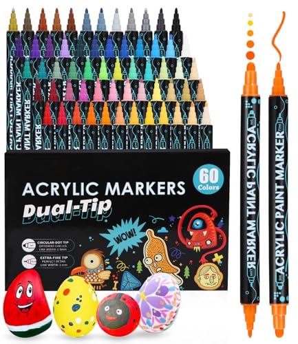 Akrylpennor för vattentät, 60 pennor dubbel spets akrylfärger pennor stenar måla set, akrylfärger för stenar trä, glas, duk, sten, tyg, gör-det-själv fotoalbum, keramik
