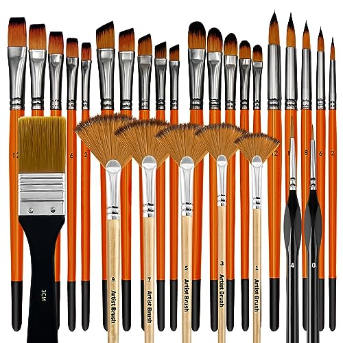 Bougimal penselset akrylfärger, set med 28 akrylpenslar, konstnärsborste med rund, fyrkantig, platt, fläktpenselset för konstnärer och nybörjare för målning (orange)