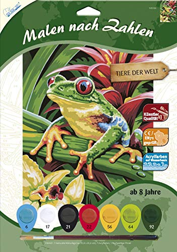 MAMMUT 105103 – Målning med siffror djurmotiv, trädgroda, komplett set med tryckt målarmall i A4-format, 7 akrylfärger och penslar, målningsset för barn från 8 år