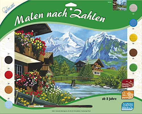 MAMMUT 109030 – måla efter siffror landskapsmotiv, bergidyll, komplett set med tryckt målarball i A3-format, 10 akrylfärger och borstar, stort måleriset för barn från 8 år