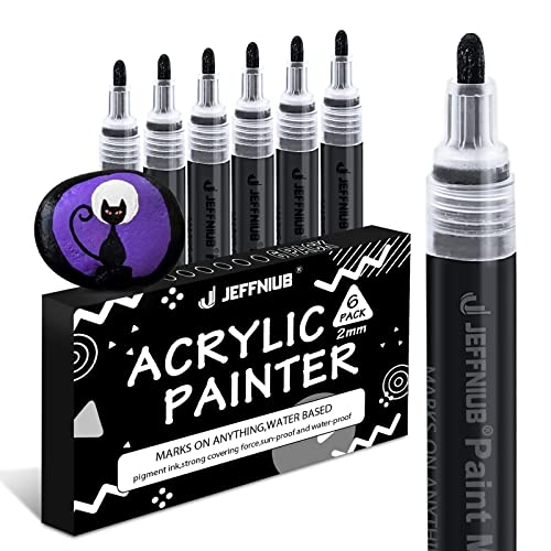 JEFFNIUB Svart akrylpennor tjocka spetsar 6 stycken, akrylfärger pennor set vattentät svart märkpenna för trä, metall, glas, tyg, stenar måla