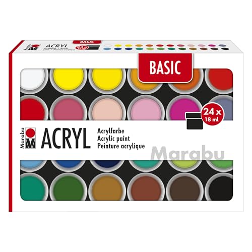 Marabu akrylfärger set BASIC, 24 x 18 ml sidenmatt färger, lätt att måla, snabbtorkande, ljusäkta, väderbeständig, för många målningstekniker och underlag, 121000000215, flerfärgad