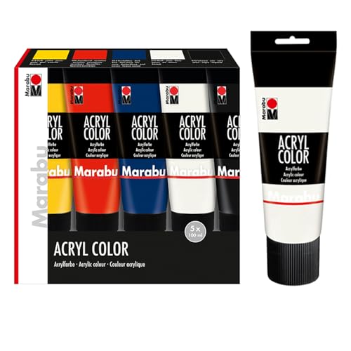 Marabu Akrylfärger set, 225 ml vit och 5 x 100 ml, krämig, vattenbaserad akrylfärg, snabbtorkande, ljusäkta, vattentät, för användning med pensel och svamp på duk, papper, trä