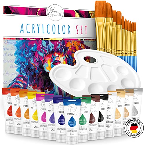 Amandi Van Gaunet akrylfärger set – 16 akrylfärger med 75 ml pigment och 10 penslar – vattentätt akrylfärgset för papper, sten, trä, keramik, tyg, duk och glas – snabbtorkande