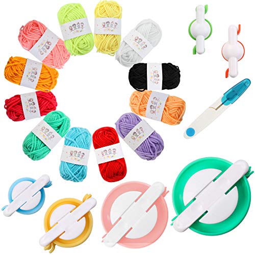 Set med 19 st pompom tillverkare, inklusive 12 nystan akrylgarn, 6 storlekar pom-pom Maker fluffbollförvaring, 1 par sax, verktygssats för tillverkning av pom-pom
