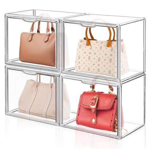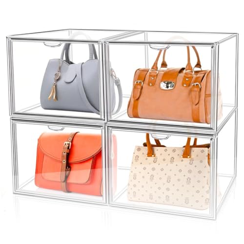 PLECUPE 4 stycken transparent förvaringslåda, monter i akryl, 40 x 25 x 30 cm akryllåda, stapelbar akrylvitrinskåp, plexiglaslåda, monter för handväskor förvaring bokleksaker