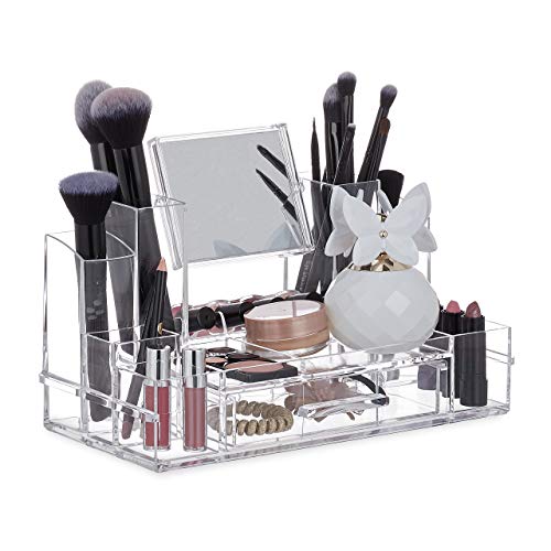 Relaxdays Sminkorganisatör med låda, stor akryllåda med spegel och fack, HWD 19 x 30 x 14,5 cm, klar