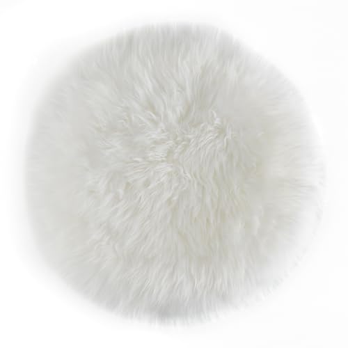 -LUXOR – levande pälskudde, äkta päls, fluffig sittdyna, sittdyna av lammskinn, läderbaksida, päls för stolar, rund 34 cm, färg: vit, kvantitet: 1 kudde