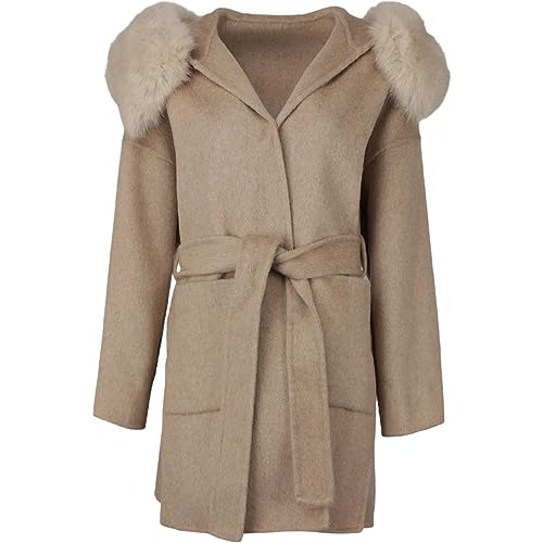 Dam oversize kashmir kappa Leya med XXL-krage av 100 % äkta päls, ullrock, Kamel, M
