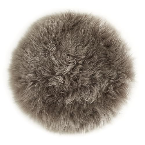 -LUXOR – levande pälskudde, äkta päls, fluffig sittdyna, sittdyna av lammskinn, läderbaksida, päls för stolar, rund 34 cm, färg: taupe, antal: 1 kudde
