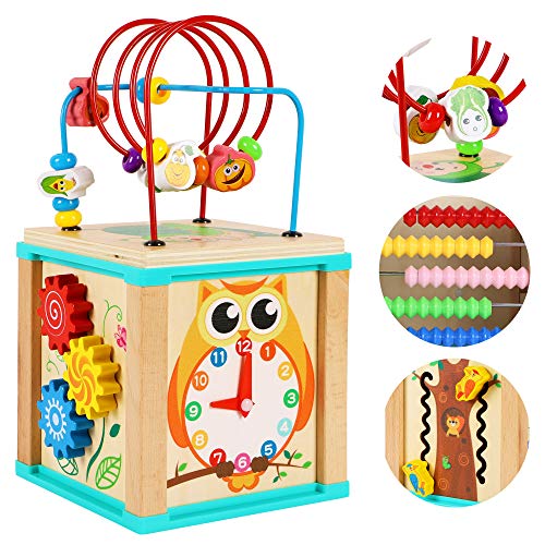 TOWO Träaktivitet kub pärlor labyrint – 5 aktiviteter bergsunderlägg akus kugghjul växlar klocka sicksack slide-tidigt pedagogiska leksaker för baby – pedagogiska träleksaker för 1-årig