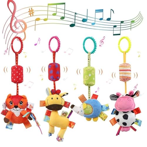 Hängande barnvagnsleksaker, 4-pack tidig utveckling plyschvagnar, babyleksaker för 0 3 6 9 12 månader, aktivitetsleksak för nyfödd skallra