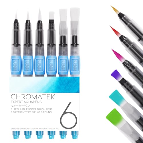 CHROMATEK Professionella Aquapens 6-pack – Vattenpenslar för målning, vattenfyllda penselpennor med 6 olika spetsar, portabla akvarellpenslar för konstnärer, vuxna och nybörjare