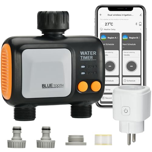 Bevattningsdator WLAN 2 utgångar med 300 M RF-teknik, bevattningsklocka för trädgårdsbevattning kompatibel med Alexa & Smart Life-app, automatiskt bevattningssystem för trädgård, gräsmatta