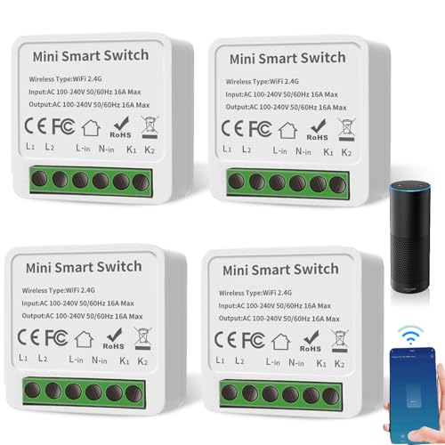 4 stycken smarta strömbrytare modul 2-vägs, Smart Life-brytare, kompatibel med Tuya App, Alexa och Google Home, mini gör-det-själv WLAN-brytare, neutral ledare krävs, passar bakom väggströmbrytare