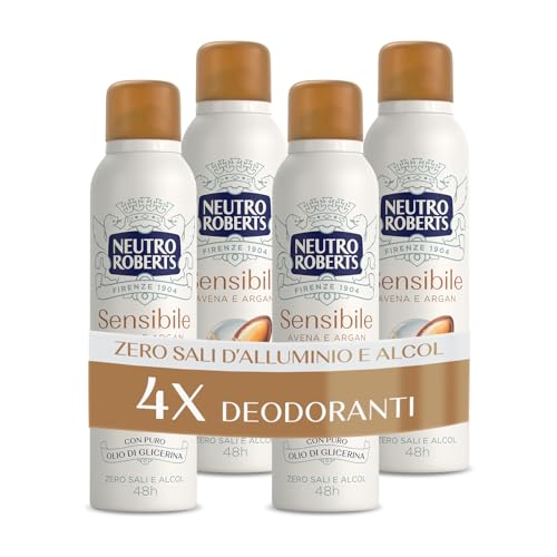 Neutro Roberts, Känslig hud Deodorant Spray med lugnande havre och argan, noll aluminiumsalter, noll alkohol, med ren glycerinolja, dermatologiskt testad, 48 h - 4 st på 150 ml