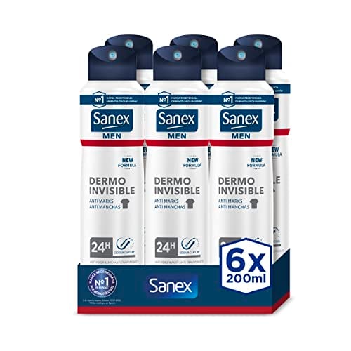 Sanex Men's Dermo Invisible Deodorant Spray för män, Pack 6 st x 200 ml, 24H skydd, antiperspirant, anti-irritation, 0% alkohol, anti-vita fläckar, bekämpar dålig lukt