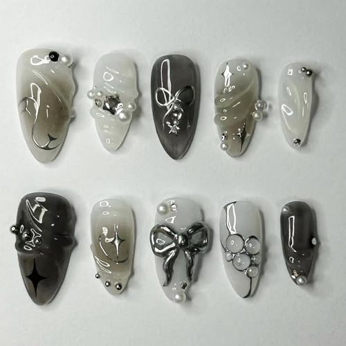 GlamRays 24 stycken svart tryck på naglar medium almond falska naglar med 3D metallrosett pärldesign, svart gradient, komplett överdrag, falska naglar, vattendroppar